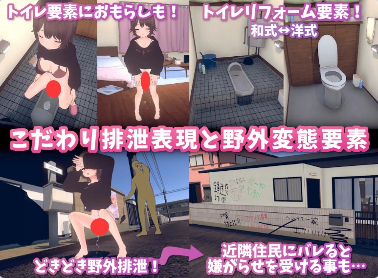 根据时间推移和饮食状况,女主角会进行排泄行为。如果来不及上厕所,还可能尿裤子…。此外,在浴室内也可以直接排尿…。