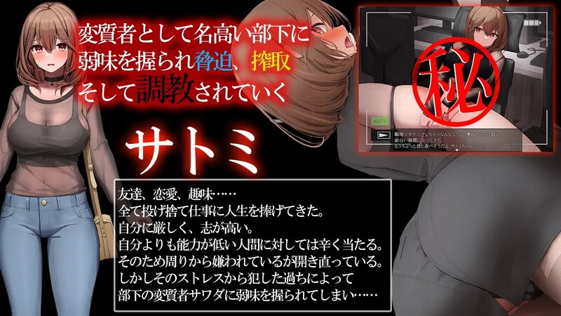 通过拍摄Satomi在公司里自慰的情景,他胁迫Satomi并强迫她进行淫乱行为。Sawada的目的是在训练Satomi成为变态之后,将她推向毁灭。