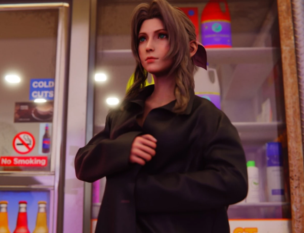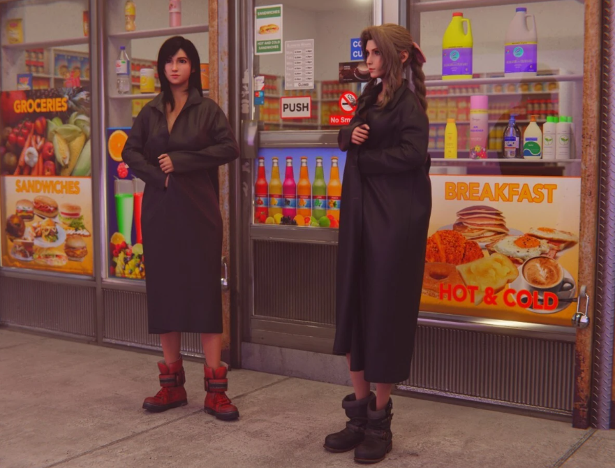 ティファとエアリスが道端でコートを開いて裸を晒し、男を誘惑するシーン